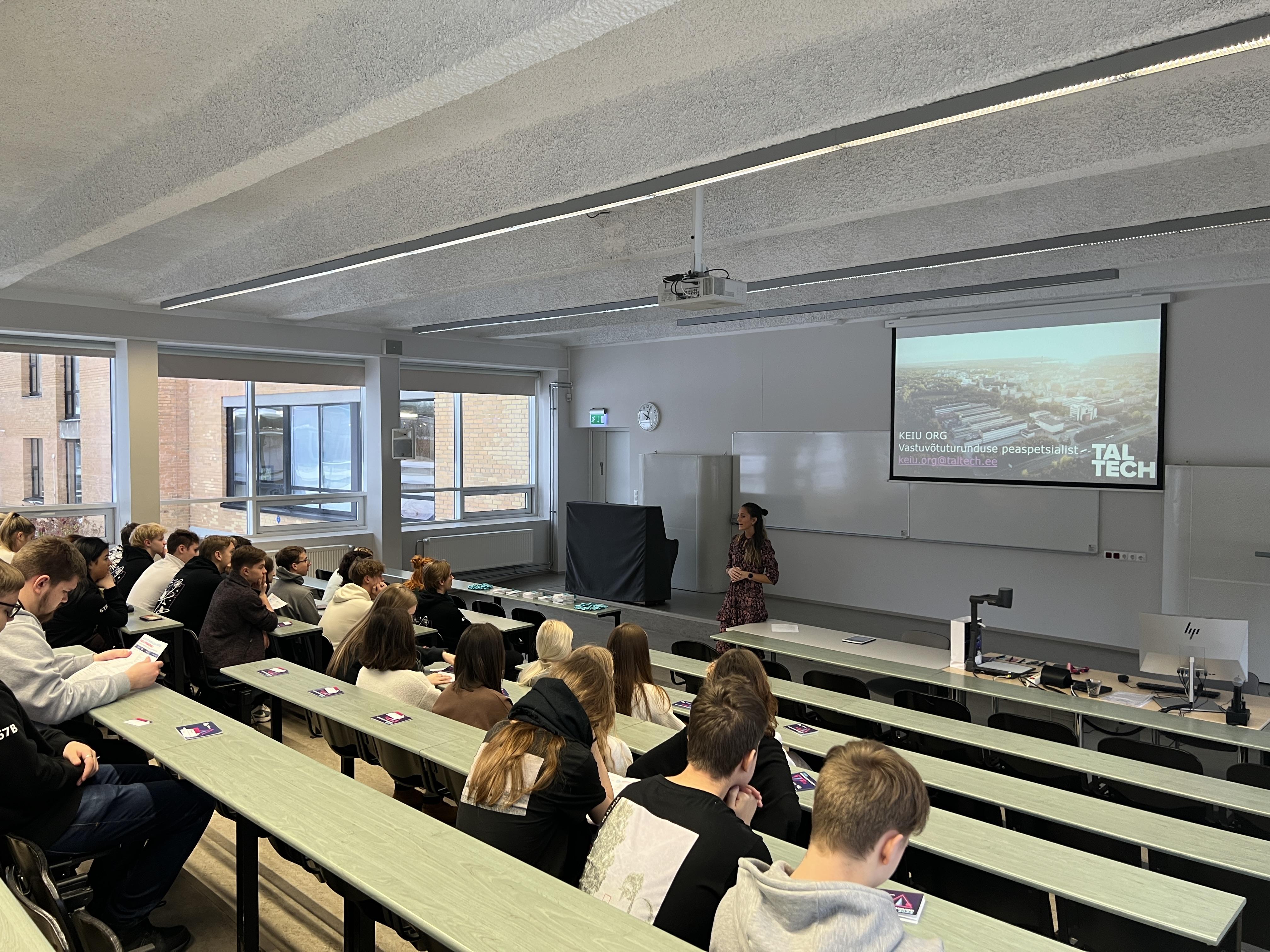 TalTechis koordineeris meie külaskäiku vastuvõtuturunduse spetsialist Keiu Org, kes andis ka põhjaliku ülevaate ülikoolist, õppimisvõimalustest, sisseastumistingimustest ja tudengielust.