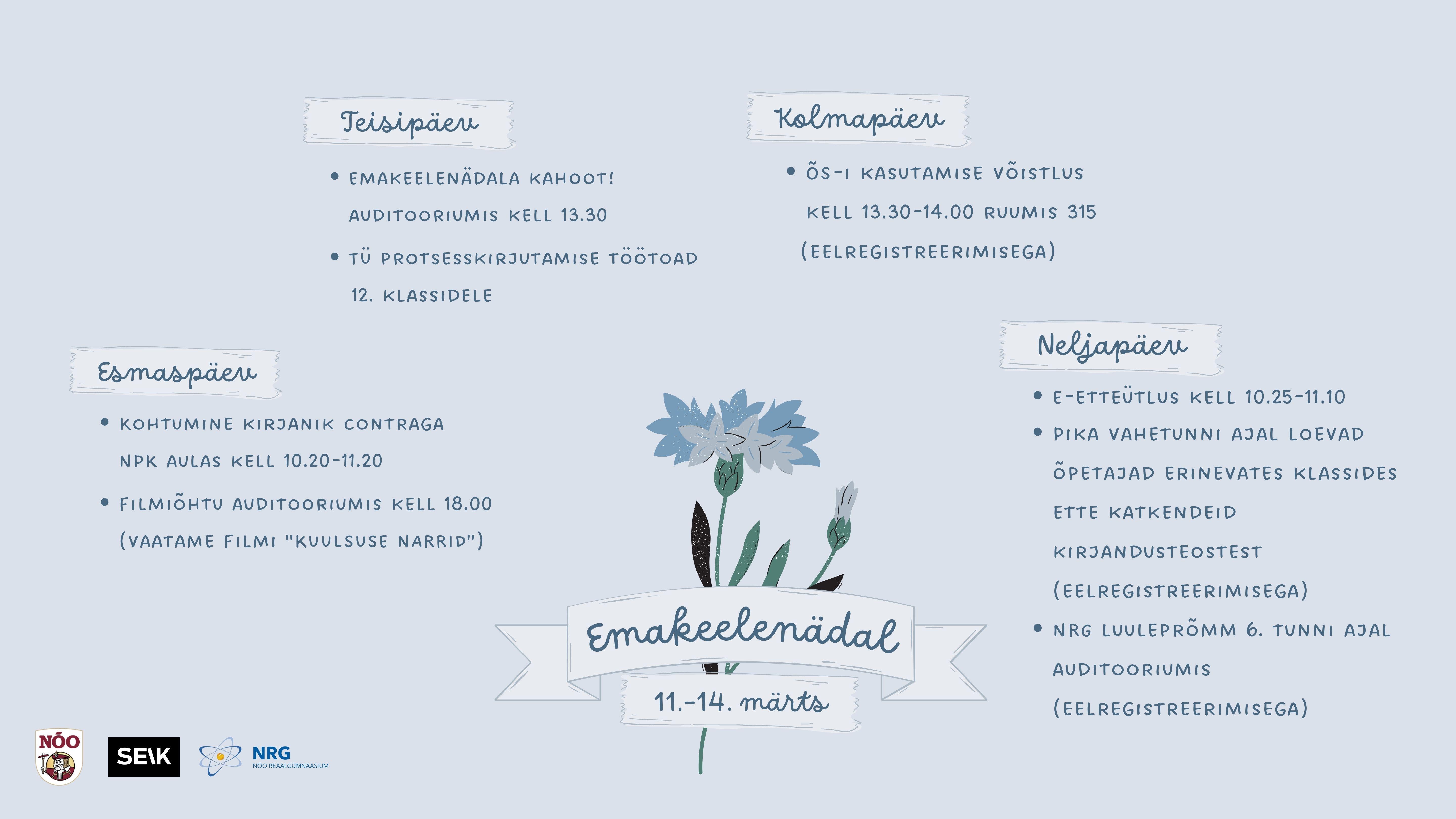 * kell 13.30-14.00 ruumis 315 ÕS-i kasutamise võistlus. ÕS-i abil tuleb vastata erinevatele küsimustele, millega kontrollitakse oskust sõnaraamatut kasutada. Kasutada saab vaid ÕS-i raamatu kujul, veebiallikaid kasutada ei tohi. I koha võitjale auhind Nõo Lihatööstuselt, II ja III kohale magus auhind.
