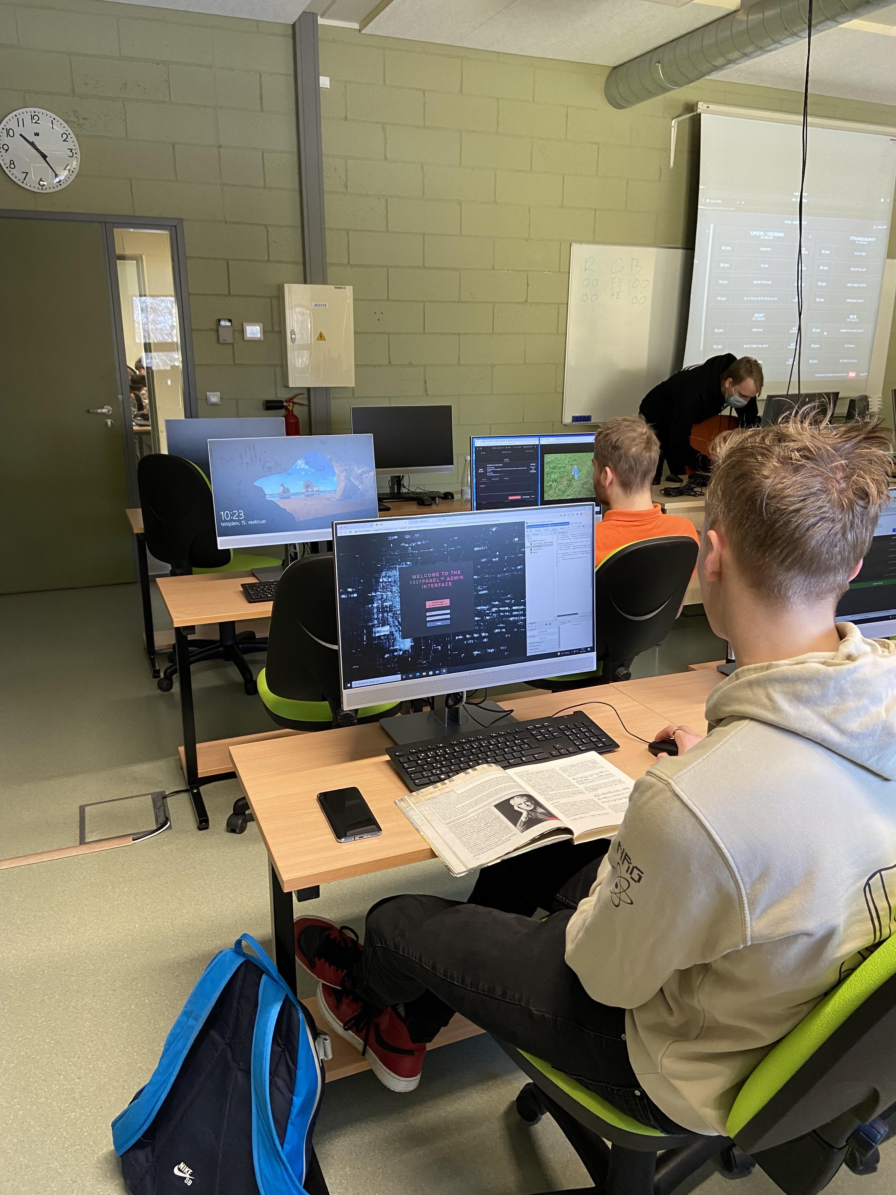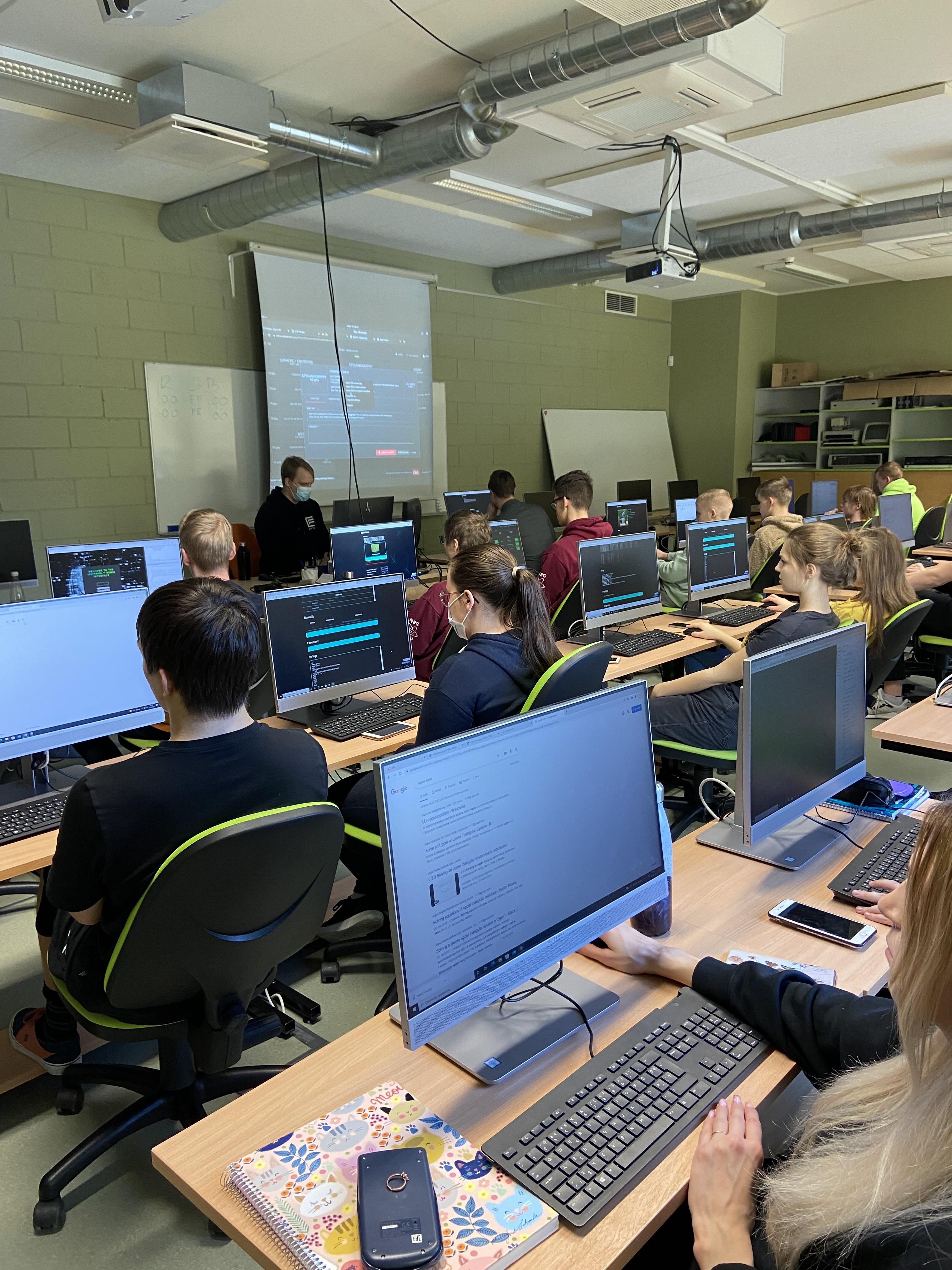 Sõbrapäevajärgset hommikut alustas 12.b küberturvalisuse teemadel, mida tulid kooli tutvustama Marki Tihhonova-Kreek ja Rain Nõmmsalu. Firma CTF TECH töötajad käivad koolides Capture the Flagi tutvustamas, et noored üha arenevas ja kasvavate ohtudega netimaailmas turvaliselt enesekaitseks häkkida oskaksid. Abituriendid said käed külge panna CFT- keskkonnas, lahendades mitmekesiseid ülesandeid. Koolitajad esitlesid õpilastele erinevaid koodide tõlkimise ja pilditöötlemise keskkondi, mille tundmine tulevikus kasulikukski võib osutuda.
