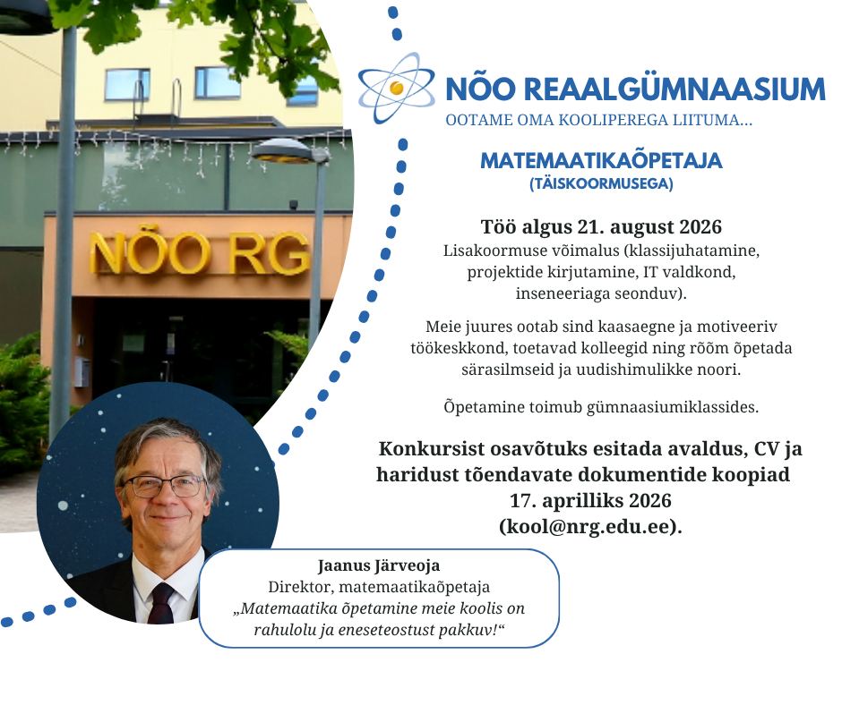 Nõo Reaalgümnaasium võtab alates 21. augustist 2026 tööle täiskoormusega matemaatikaõpetaja.